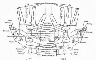 The application of Reflexology allows us to reach our internal workings by working on the hands, ears and feet, as shown in illustrations 2, 3 and the ear as shown in illustration 6. Reflexology is very good as a preventive technique and assisting in recovery from illnesses.